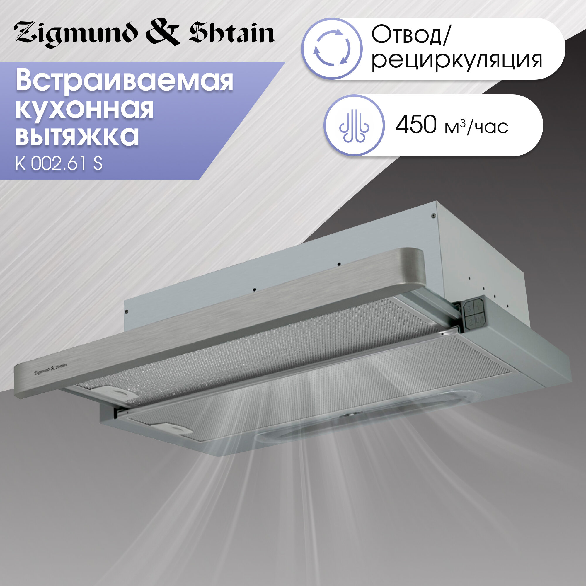 В/о выдв.блок Zigmund&Shtain K 002.61 S /серебро, 60см, 550 куб. м/ч, 2 скор., мех. упр./Румыния