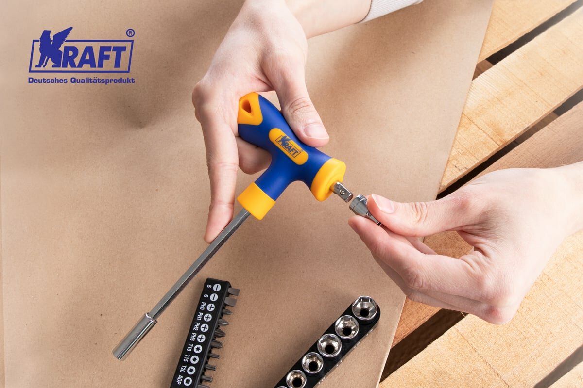 KRAFT KT701039 Набор: Т-образная отвертка с насадками-битами и торцевыми головками 20 предметов
