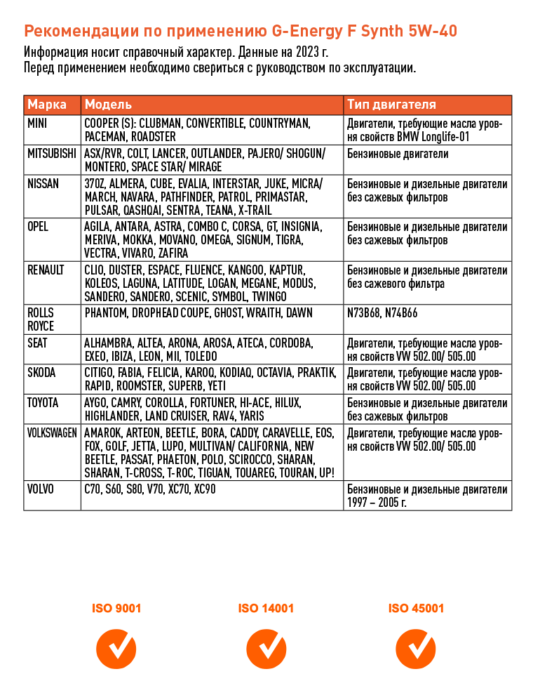 | Допуски OEM | PSA B71 2296 / VW 505.00 / VW 502.00 / BMW Longlife-01 / Renault RN 0710 / PORSCHE A40 / Renault RN 0700 / GM-LL-B-025 / MB 229.5 |