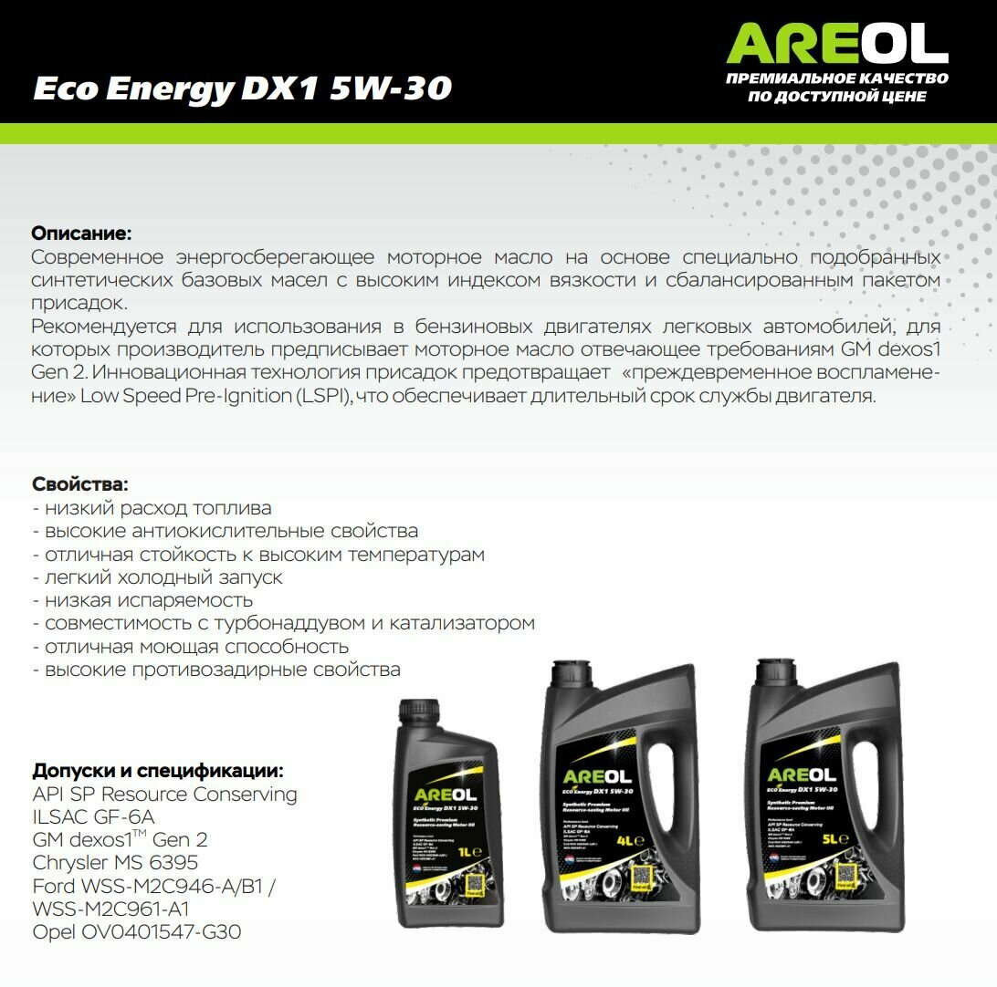 areol 5w30ar074 areol eco energy dx1 5w30 (5l)_масло моторное! синтapi sn/sn plus, ilsac gf-5, gm dexos 1 gen 2