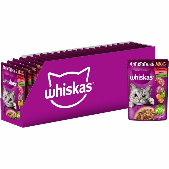Купить Корм влажный Whiskas полнорационный «Аппетитный микс» для взрослых кошек, с говядиной, языком и овощами в желе, 28шт х 75г