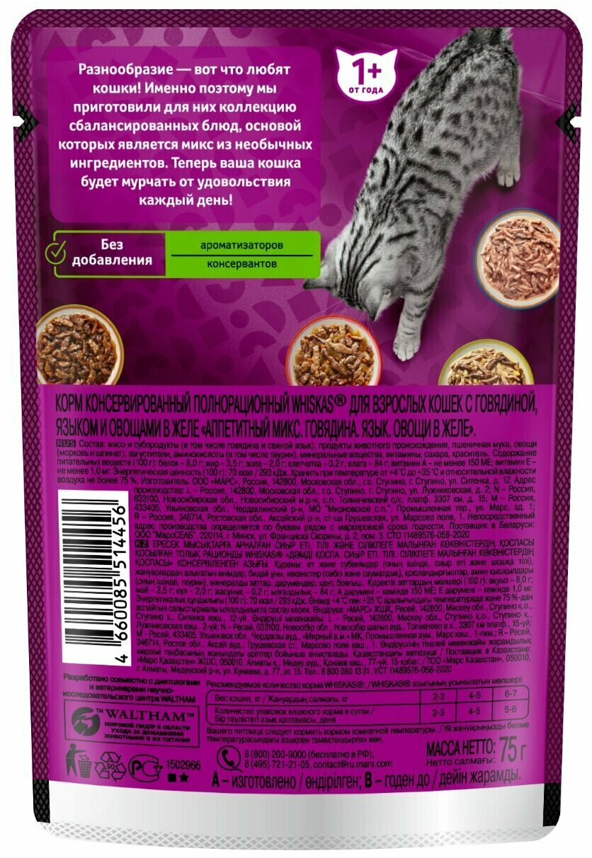 Whiskas влажный корм для кошек, аппетитный микс из говядины, языка и овощей в желе (28шт в уп) 75 гр