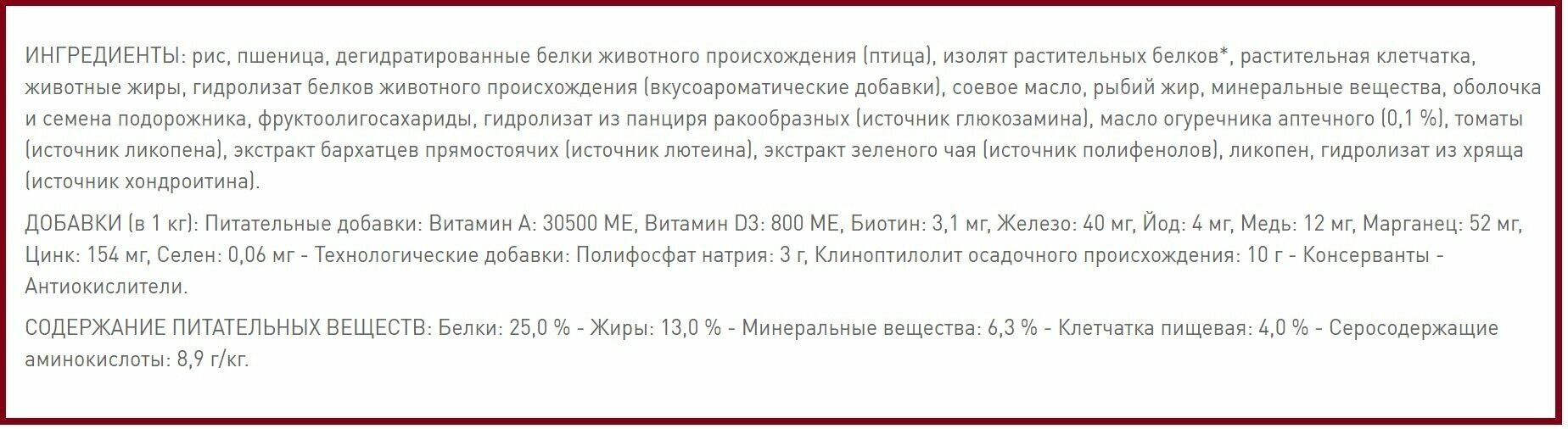 | Состав | рис, пшеница, дегидратированные белки животного происхождения (птица), изолят растительных белков, растительная клетчатка, животные жиры, гидролизат белков животного происхождения (вкусоароматические добавки), соевое масло, рыбий жир, минеральные вещества, оболочка и семена подорожника, фруктоолигосахариды, гидролизат из панциря ракообразных (источник глюкозамина), масло огуречника аптечного (0,1 %), томаты (источник ликопена), экстракт бархатцев прямостоячих (источник лютеина), экстракт зеленого чая (источник полифенолов), ликопен, гидролизат из хряща (источник хондроитина) |
