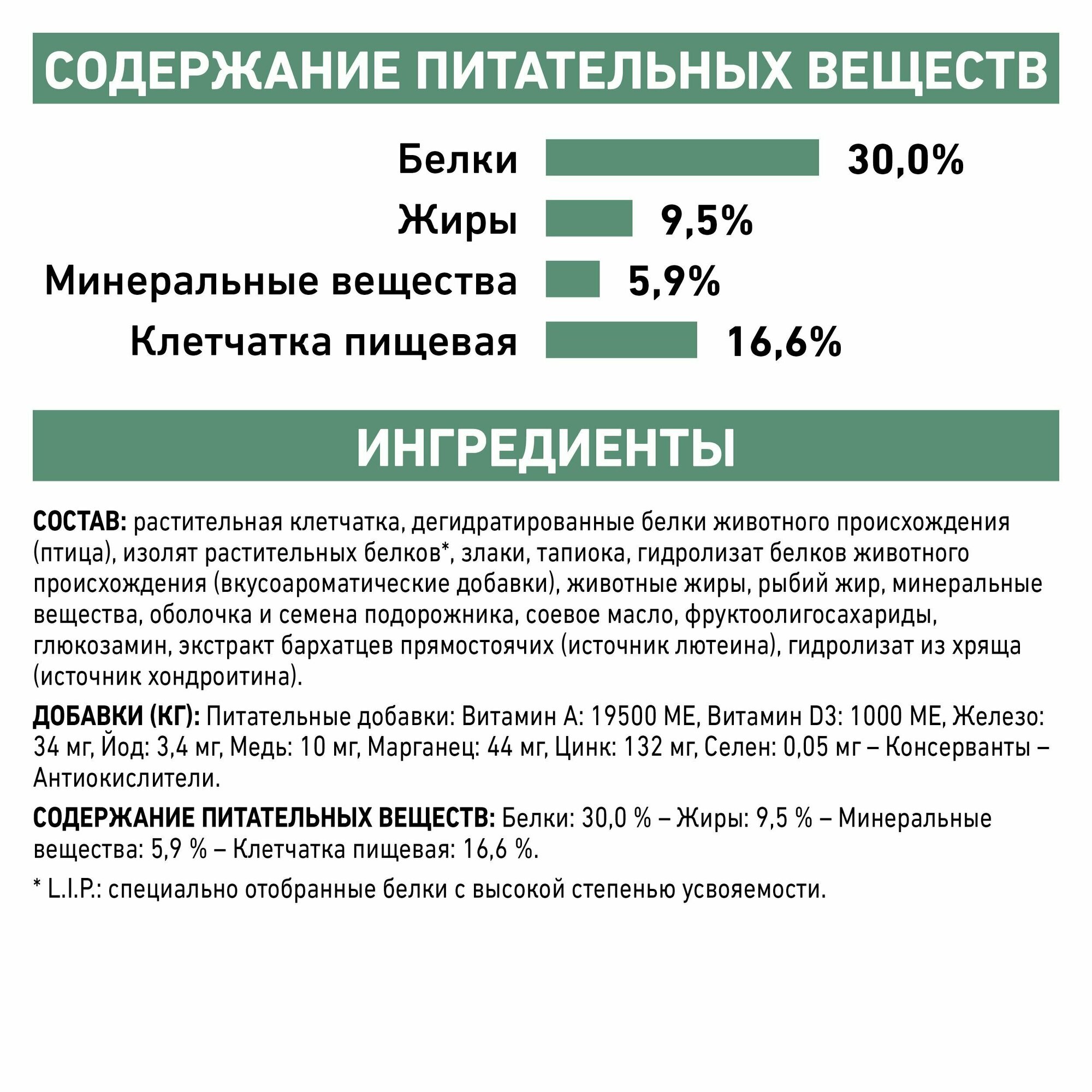 | Состав | растительная клетчатка, дегидратированные белки животного происхождения (птица), пшеничная клейковина*, тапиока, кукурузная клейковина, гидролизат белков животного происхождения (вкусоароматические добавки), пшеница, кукуруза, животные жиры, свекольный жом, рыбий жир, минеральные вещества, фруктоолигосахариды, оболочка и семена подорожника, соевое масло, гидролизат из панциря ракообразных (источник глюкозамина), экстракт бархатцев прямостоячих (источник лютеина), гидролизат из хряща (источник хондроитина) |