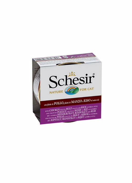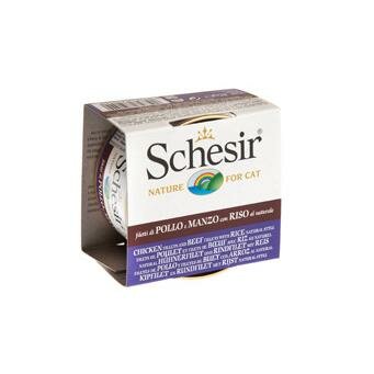 SCHESIR CAT CHICKEN & BEEF & RICE для взрослых кошек с цыпленком, говядиной и рисом в собственном соку (85 гр)