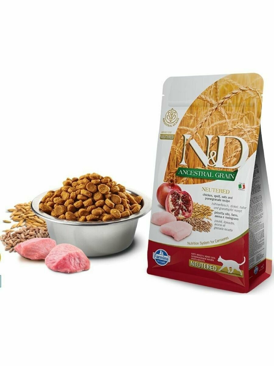 Сухой корм Farmina N&D Ancestral Grain Chicken & Pomegranate Adult Neutered, для взрослых стерилизованных кошек/котов, курица и гранат, 1,5 кг