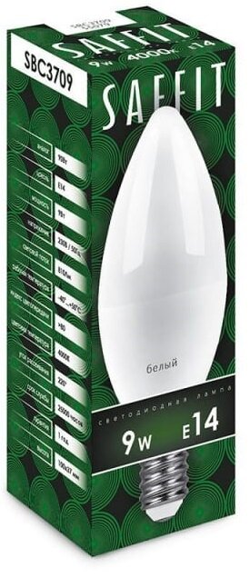 Лампа светодиодная E14, 9 Вт, 90 Вт, 230 В, свеча, 4000 К, свет белый, Saffit, SBC3709, C37, 55079