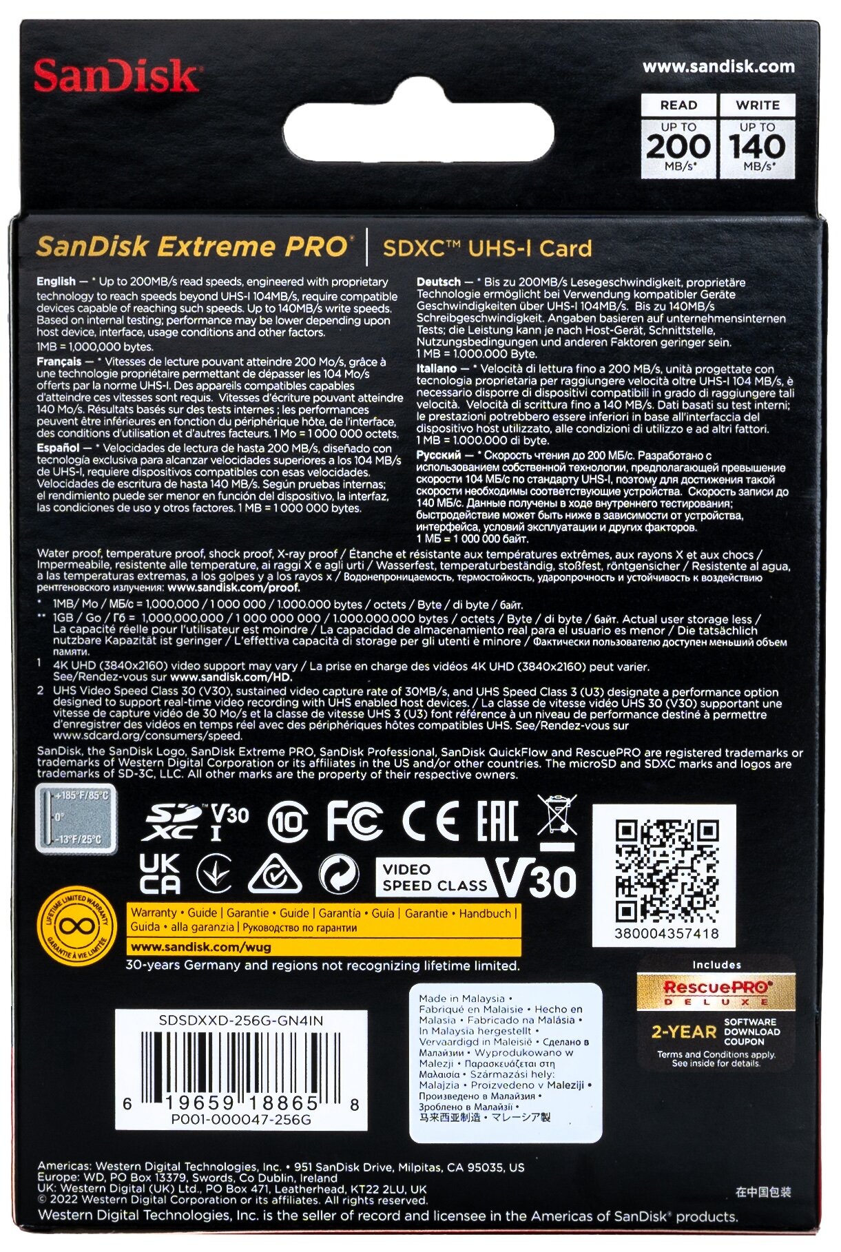 Карта памяти SanDisk SDXC 256GB Extreme Pro UHS-I V30 U3 200/140 MB/s