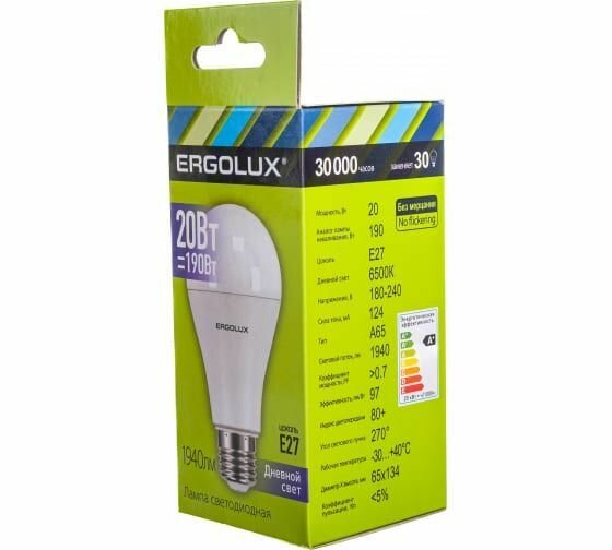 Лампа светодиодная E27, 20 Вт, 190 Вт, груша, 6500 К, свет холодный белый, Ergolux