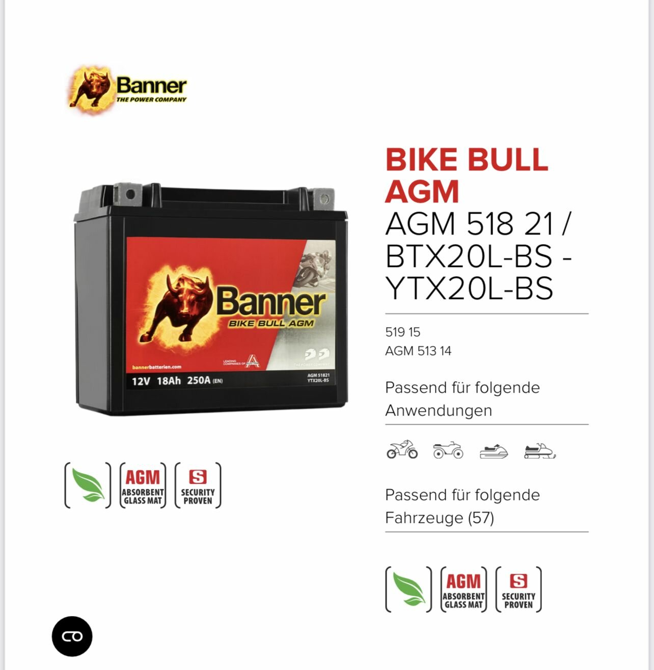Аккумулятор Banner Bike Bull AGM AGM 518 21 / YTX20L-BS, полярность обратная
