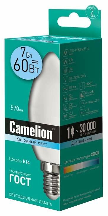 Лампа CAMELION Е14 7Вт 4500K 590Лм LED7-C35/845/E14 светодиодная 12074 нейтральный белый, свеча