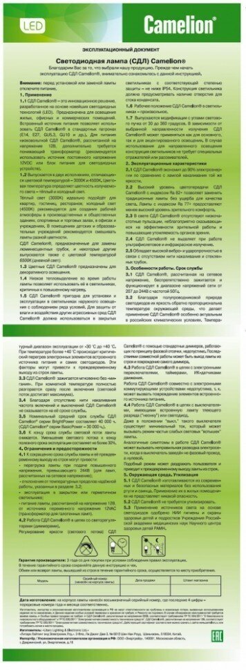 | Эквивалент лампы накаливания | 60 Вт |