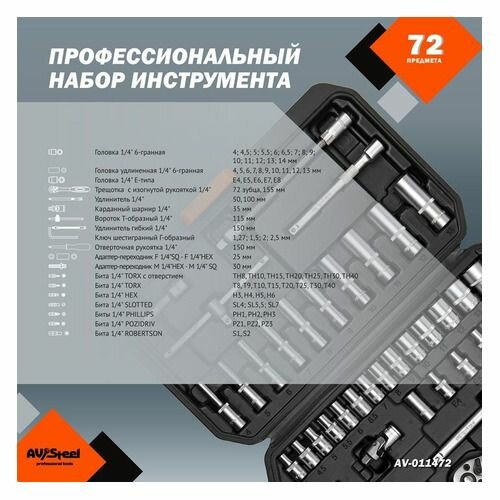AV Steel AV-011472 Набор инструмента 1/4" 6 гр. 72 пр.