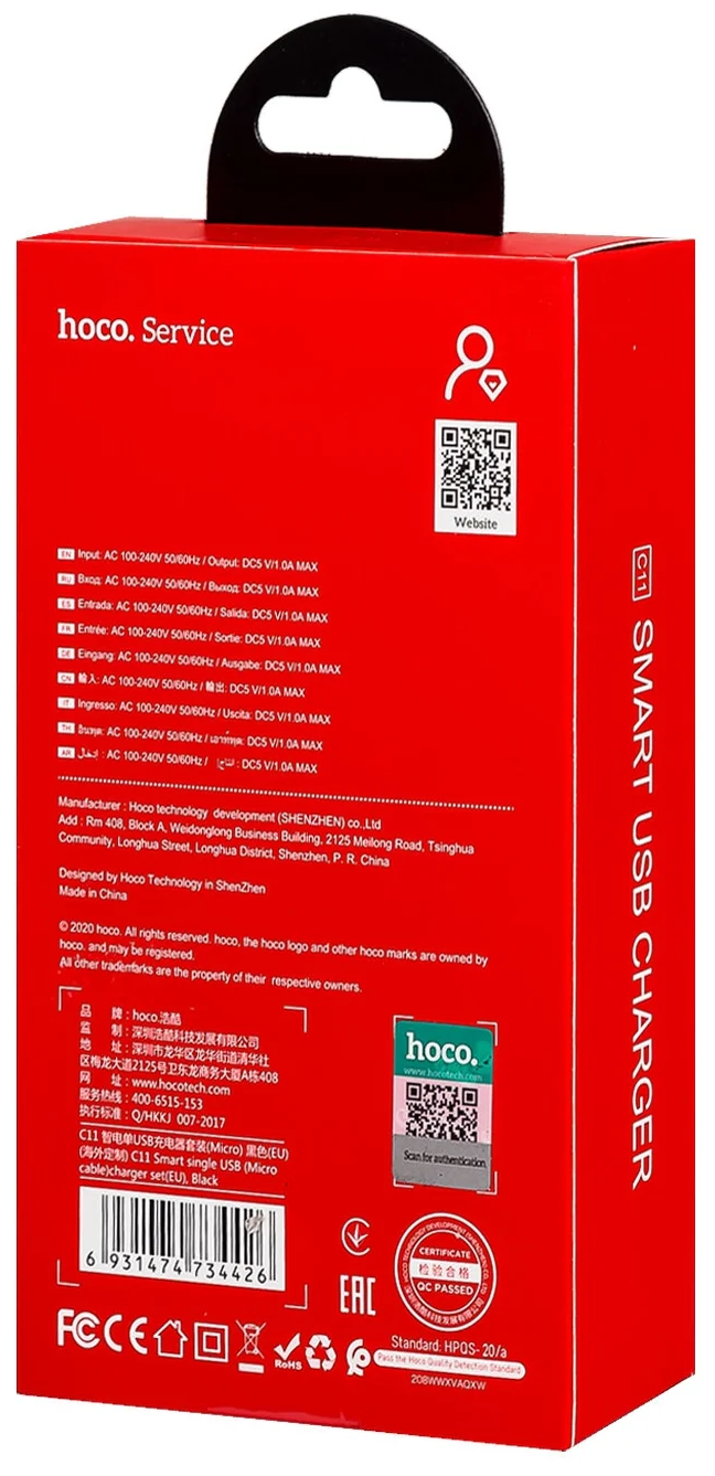 Зарядное устройство HOCO C11 Smart USB + Кабель USB-Micro, 1A, черный
