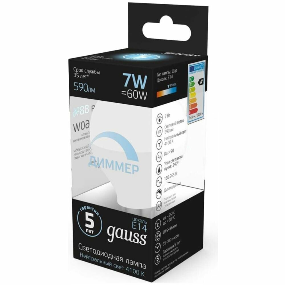 Лампочка светодиодная E14 Шар 7W 4100К 590lm диммируемая упаковка 10 штук Gauss