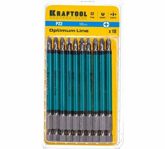 Optimum Line Биты, PZ2, тип хвостовика E 1/4″, 100 мм, 10 шт в блистере, KRAFTOOL