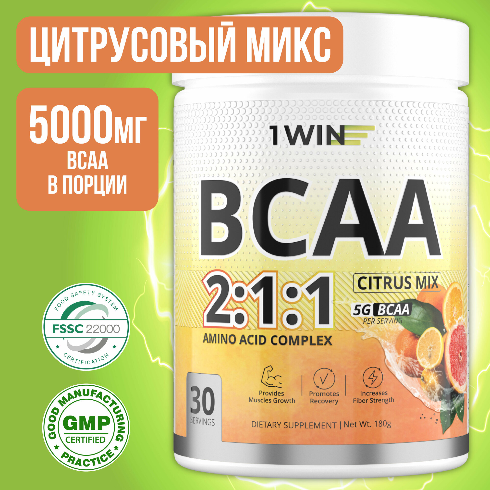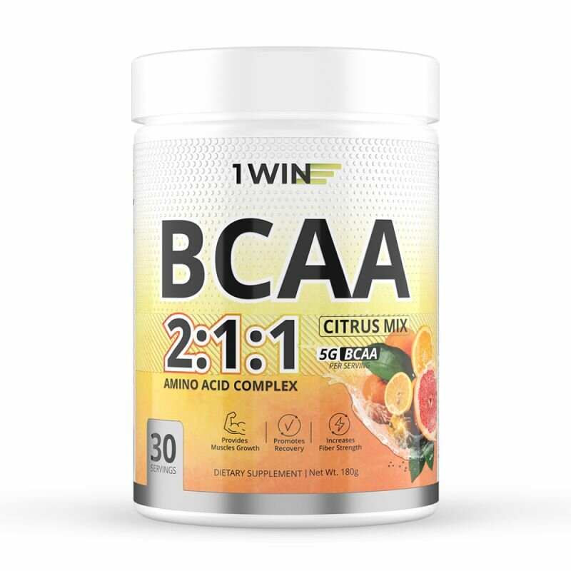 Купить 1WIN Аминокислоты BCAA 2:1:1 (БЦАА), Быстрорастворимые, со вкусом Цитрусовый микс, 30 порций, 180грамм