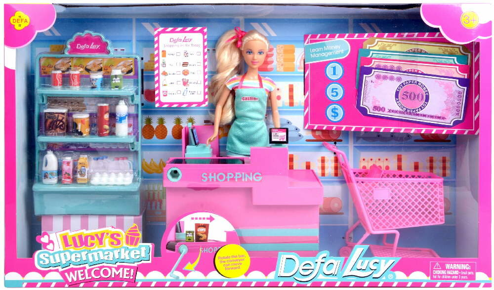 | Комплектация | кукла, витрина, кассовая зона, тележка, игровые деньги, список покупок, продукты, декоративный макет из картона с эксклюзивным рисунком интерьера |