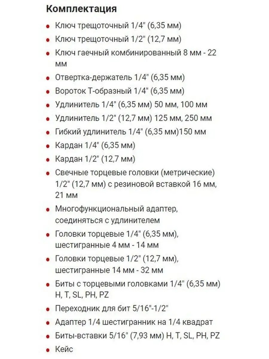 | Ручной инструмент подробно | ключ трещоточный 1/4" (6.35 мм), 72 зуба; ключ трещоточный 1/2" (12.7 мм), 72 зуба |