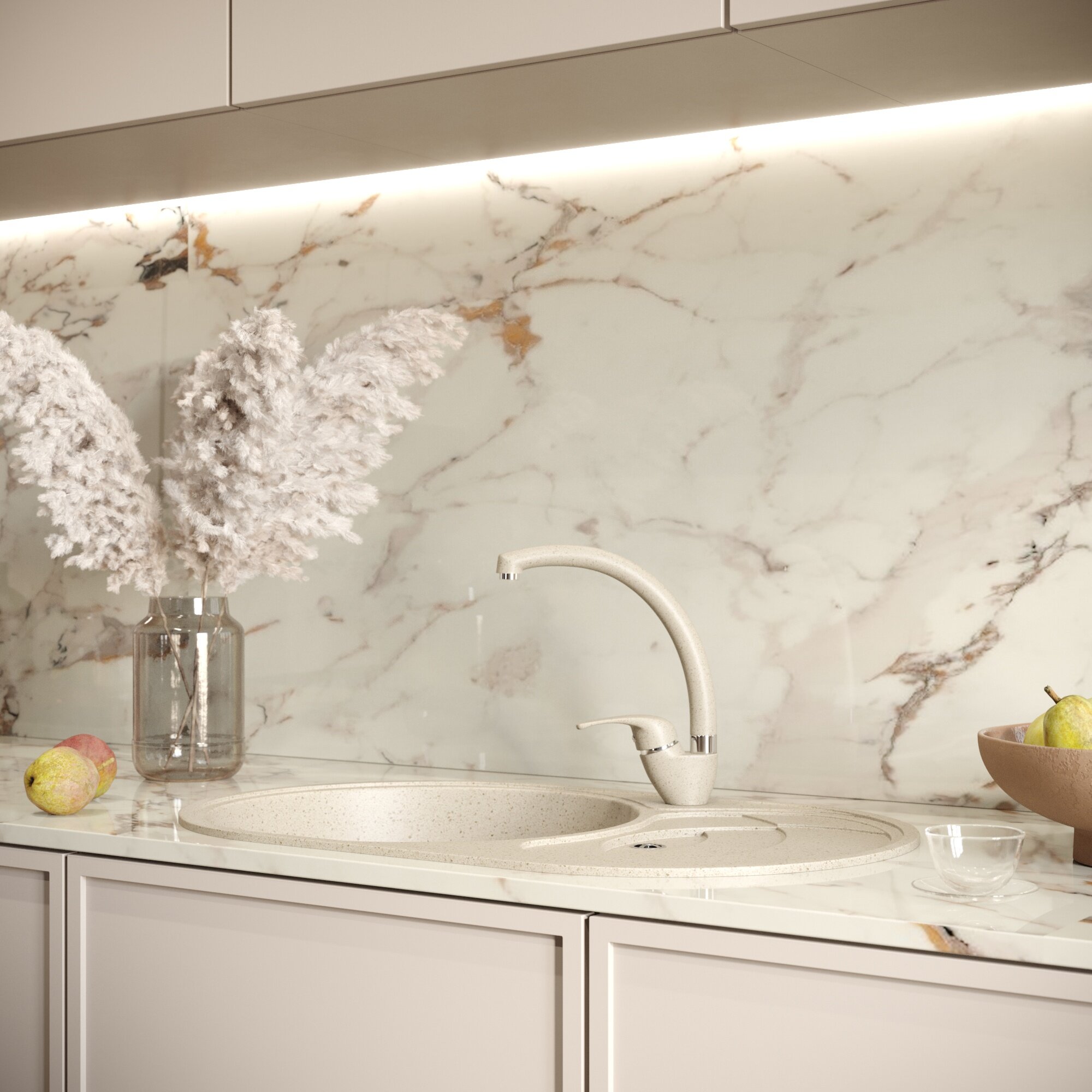 Купить Мойка кухонная Domaci Солерно EMQ-1775.C берилл, встраиваемая, накладная, с крылом, кварцевая, бежевая, овальная