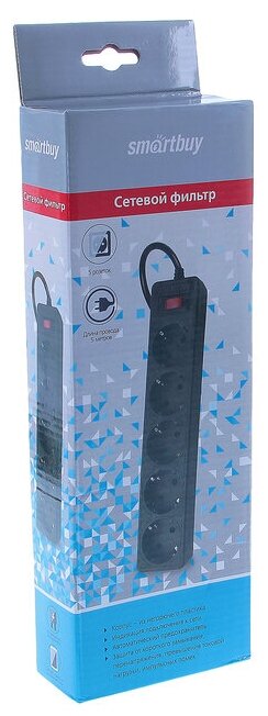 Удлинитель с функцией сетевого фильтра, 10А, 2 200 Вт, 5 розеток, длина 3,0 м, черный, Smartbuy
