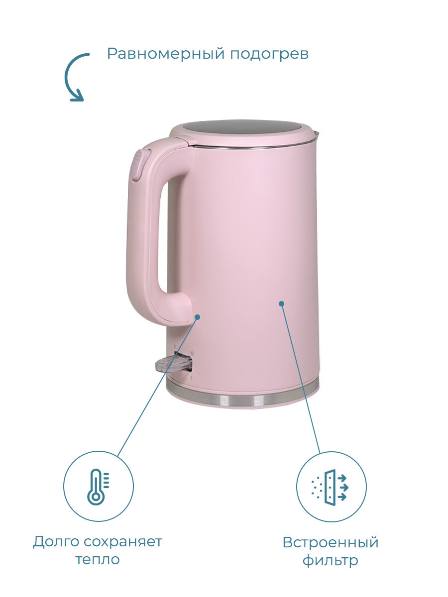 Надеюсь, не будет слишком неудобно поддерживать его изнутри в чистом виде и промывать от накипи. Именно наливать воду мне удобно. Закипает, как мне кажется, быстро. Удобная ручка, не греется. Покупала вместе с тостером этой же фирмы, тоже розовая модель. Выглядит красиво) |