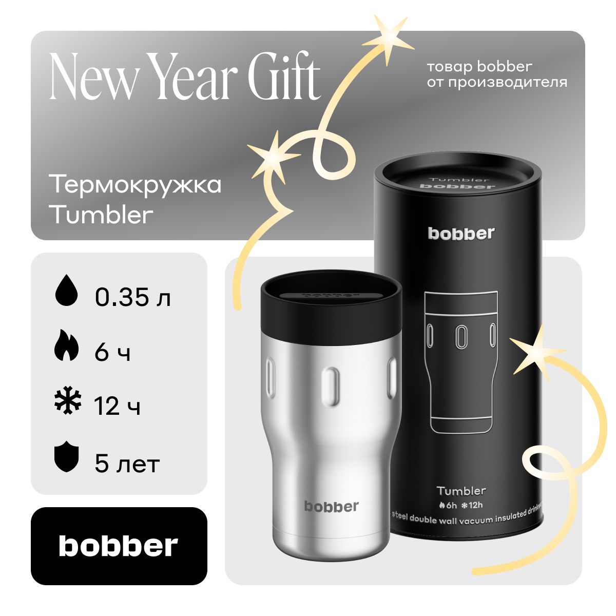 Термокружка Tumbler для кофе и чая 350 мл черная/Bobber нержавеющая сталь/подарочная