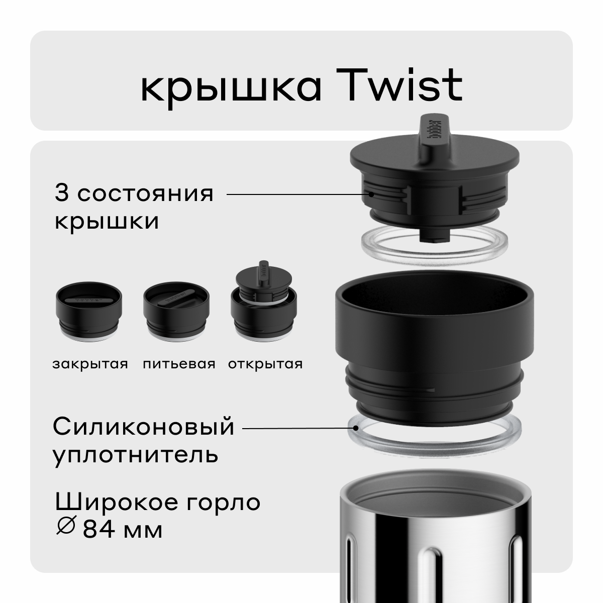 | Дополнительная информация | крышка Twist имеет три положения: 1. питьевая - прокрутите до щелчка, чтобы пить как из кружки; 2. открытая - сделайте два оборота, чтобы вытащить внутреннюю часть крышки; промойте Tumbler водой и залейте новый напиток; 3. закрытая - в таком положении температура напитка сохраняется максимально долго. Tumbler c закрытой крышкой на 100% герметичен. |
