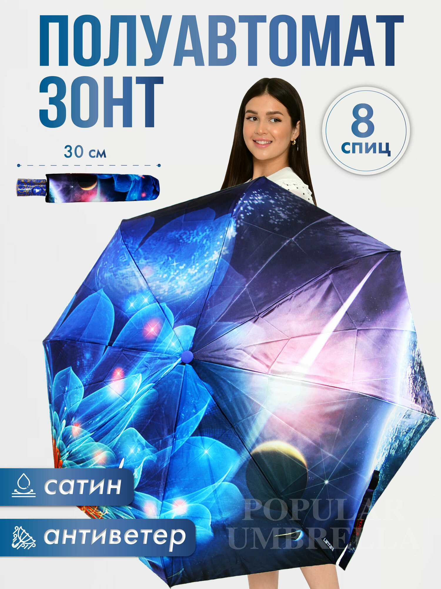 СохранитьЗонт женский полуавтомат, зонтик взрослый складной антиветер M8040, светло-синий интересное: