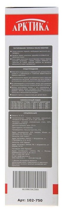 Термос "Арктика", 102, 750 мл, сохраняет тепло 24 ч, 28.3 х 7 см