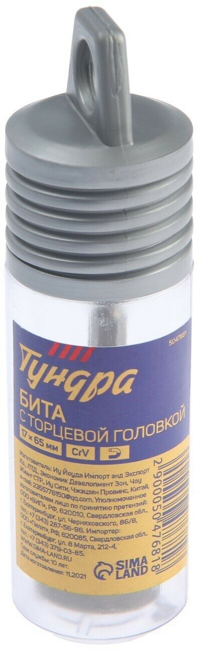 Бита с торцевой головкой тундра, сталь CrV, магнит, 17 х 65 мм, 5047681