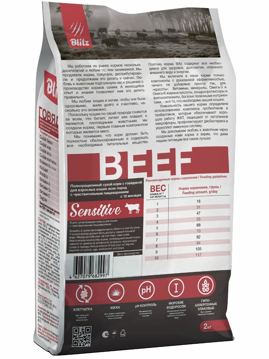 Blitz Sensitive Beef Adult Cats All Breeds сухой корм для взрослых кошек с чувствительным пищеварением, с говядиной - 10 кг