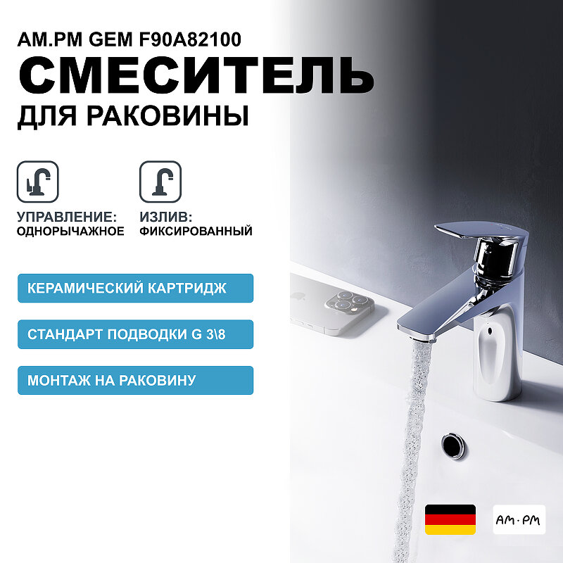Смеситель для раковины AM.PM Gem F90A82100 с донным клапаном