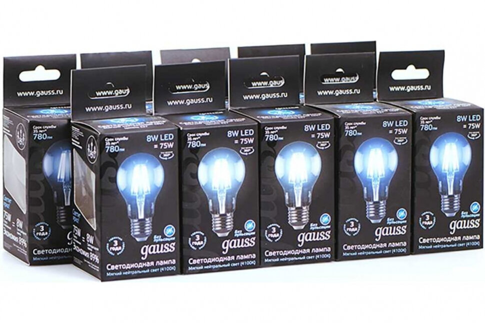(5 шт)Лампа Gauss Filament А60 8W 780lm 4100К Е27 LED 1/10/40