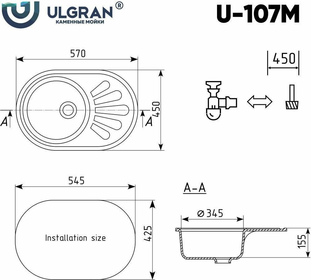 Мойка кухонная Ulgran из искусственного мрамора овальная U-107м, цвет: ультра-черный, база: 54.5х42.5 см, арт. U-107m-344
