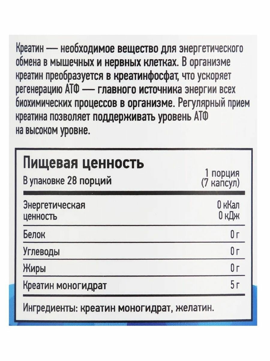 | Дополнительная информация | размер порции: 7 шт.; рекомендации по применению: первый вариант состоит из двух этапов: первую неделю необходимо принимать по 5 грамм креатина 4-5 раз в день, далее следует принимать по 5 грамм 1 раз в день, для поддержания концентрации; второй вариант: прием 5 грамм креатина 1 раз в день в течение, минимум, 30 дней; состав: креатин моногидрат, желатин |