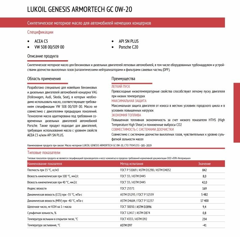 лукойл genesis armortech gc 0w-20 синт (1л) acea c5 vw 508 00/509 00 api sn plus porsche c20