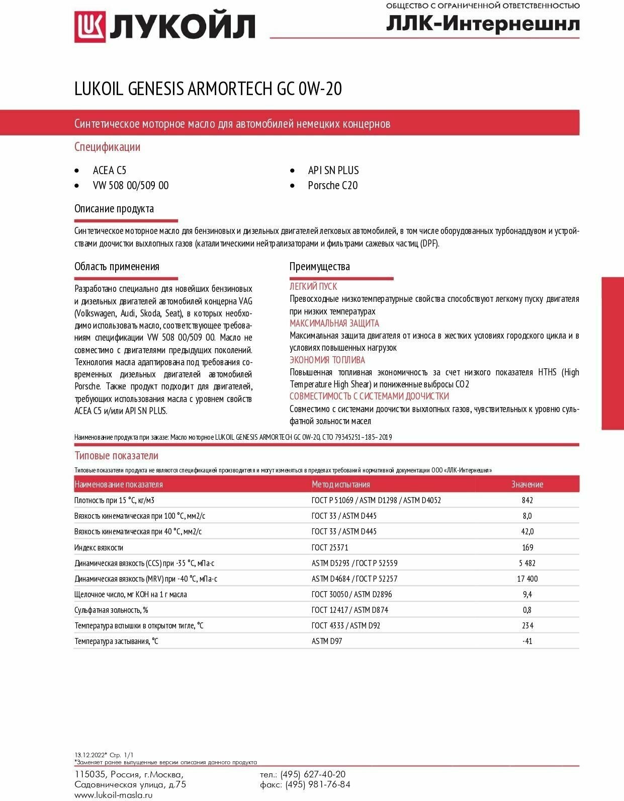 лукойл genesis armortech gc 0w-20 синт (1л) acea c5 vw 508 00/509 00 api sn plus porsche c20