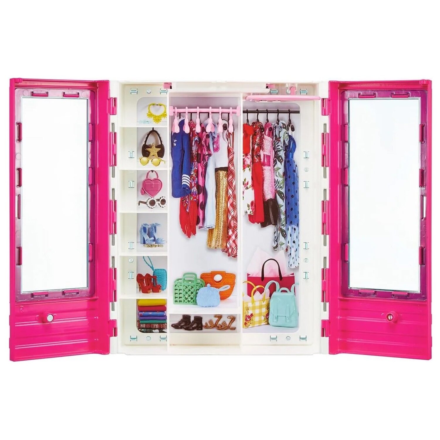 | Дополнительная информация | дополнительная одежда не входит в комплект; в гардеробе есть выдвижная вешалка и множество пространства для хранения нарядов и аксессуаров; на крыше гардероба есть ручка для переноски; двухместный розовый кабриолет оснащен ремнями безопасности и поворотными колесами |