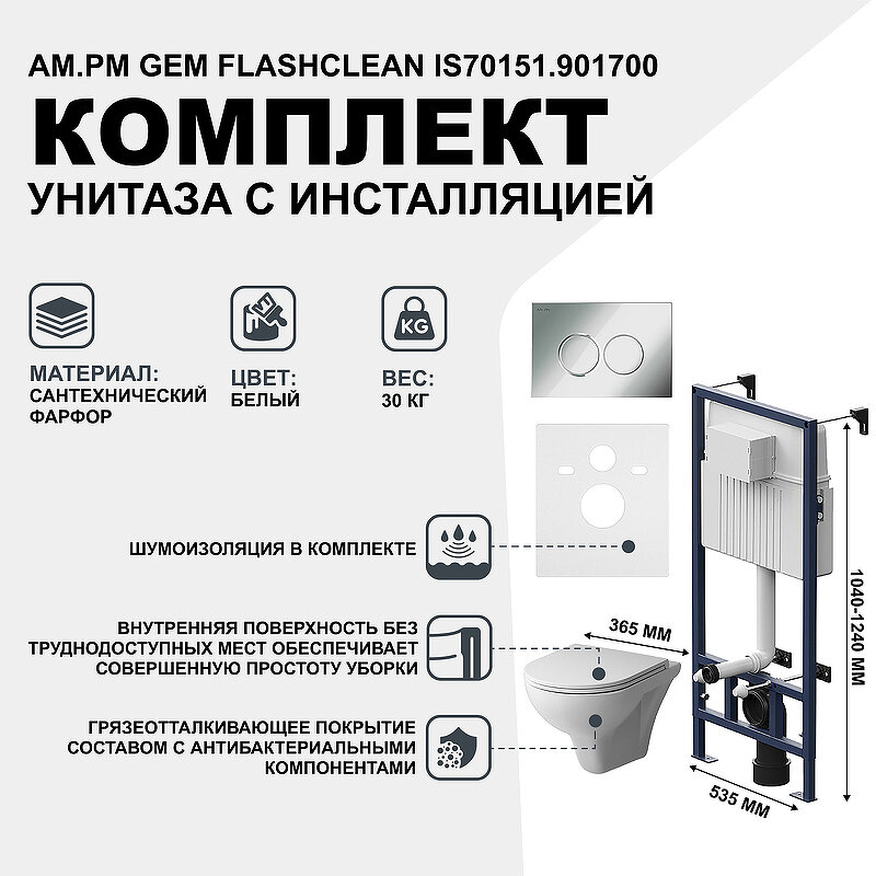 AM.PM Комплект унитаза с инсталляцией AM.PM Gem FlashClean IS70151.901700 с сиденьем Микролифт и клавишей смыва Хром глянцевый