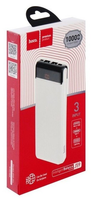 Внешние аккумуляторы Hoco Внешний аккумулятор Hoco J59, 10000 мАч, microUSB/Type-C - 2 А, iP - 1 А, 2 USB - 2 А, белый