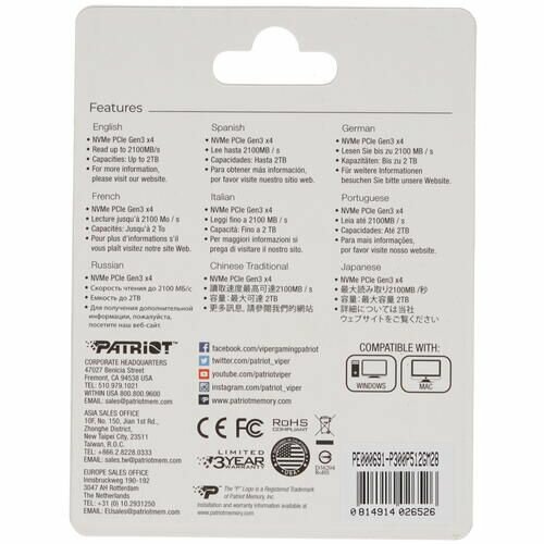 SSD диск Patriot P300 M.2 2280 512Гб Pci-e 3.0x4 NVMe Nand 3D (p300p512gm28) P300P512GM28