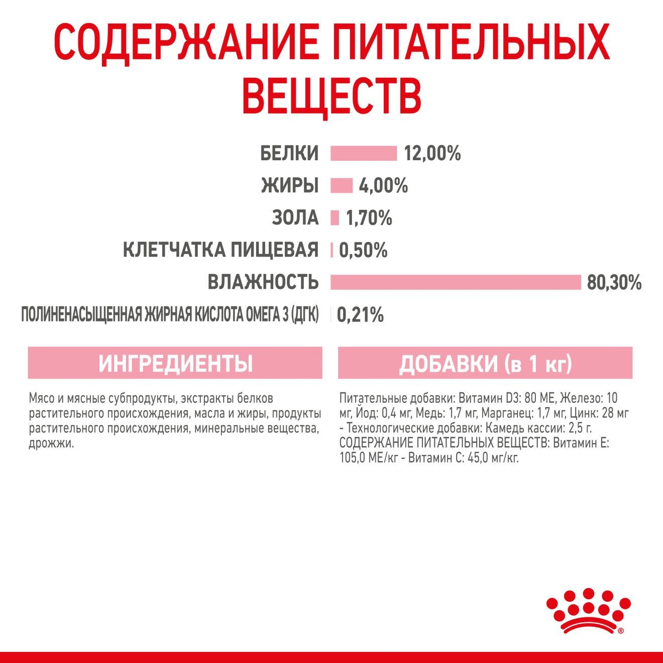 | Состав | мясо и мясные субпродукты, злаки, масла и жиры, экстракты белков растительного происхождения, субпродукты растительного происхождения, минеральные вещества, дрожжи, источники углеводов |