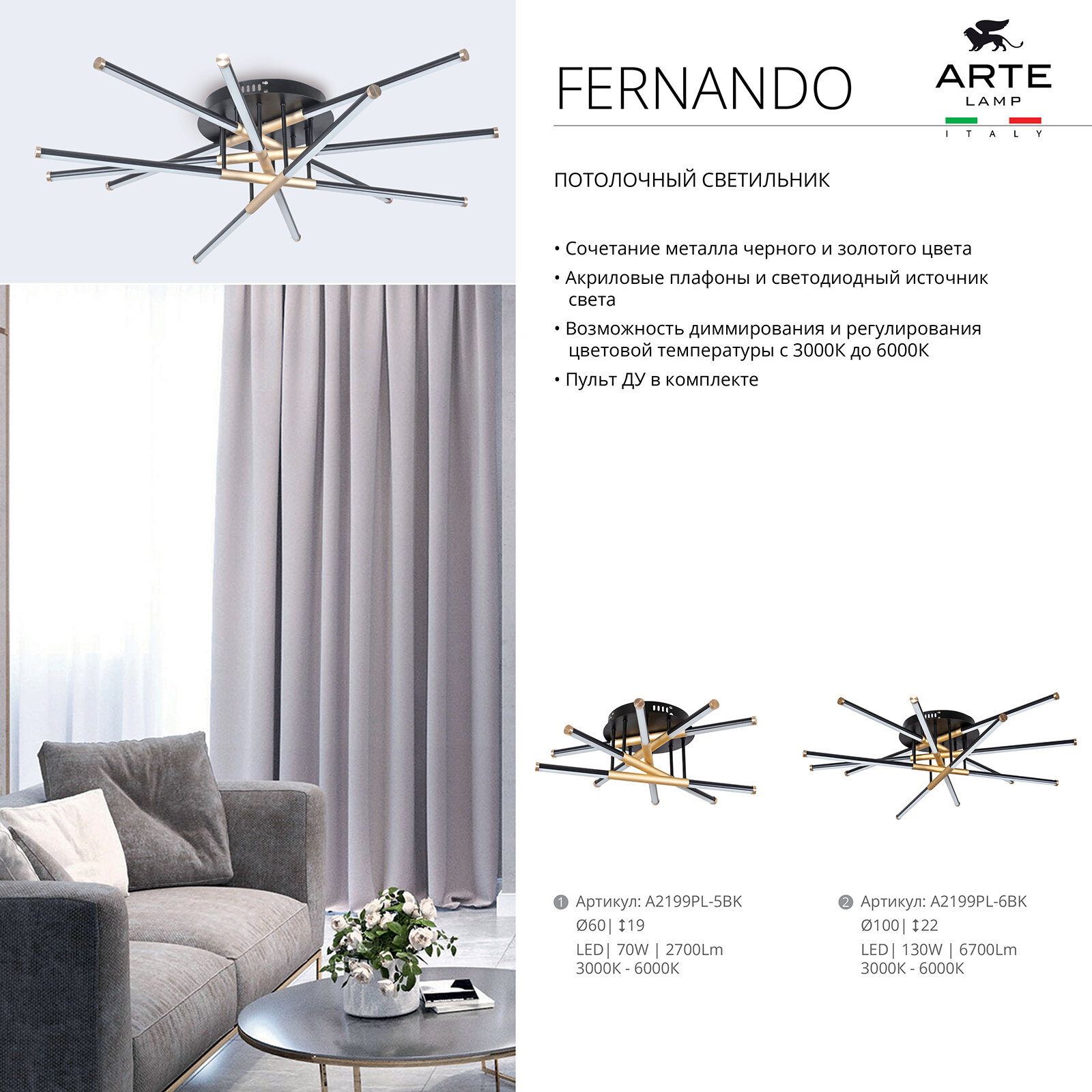 Светильник потолочный Arte Lamp FERNANDO, A2199PL-5BK, 55W, LED, Стиль Модерн