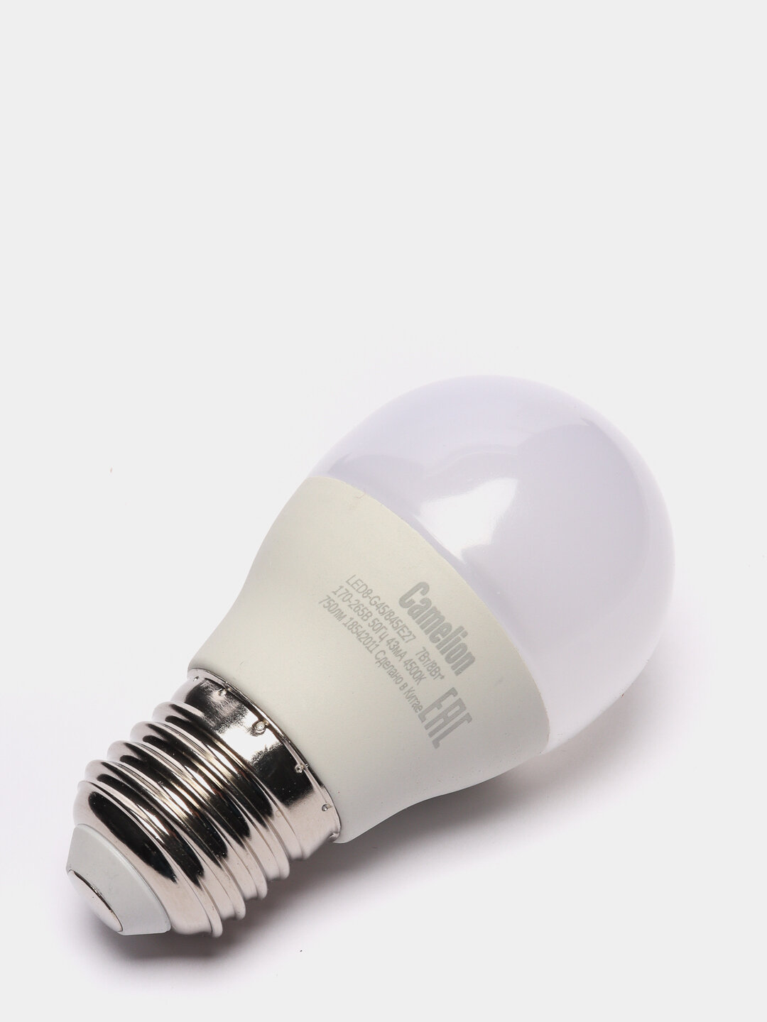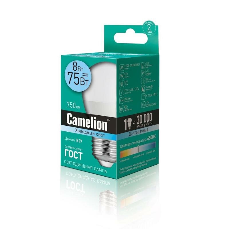 Лампа CAMELION Е27 8Вт 4500K 750Лм LED8-G45/845/E27 12394, светодиодная, нейтральный белый, шар