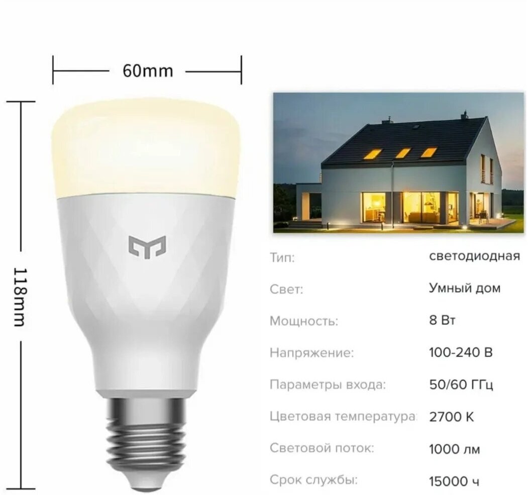 Умная LED-лампочка Yeelight White, Е27, 8 Вт, 2700 К