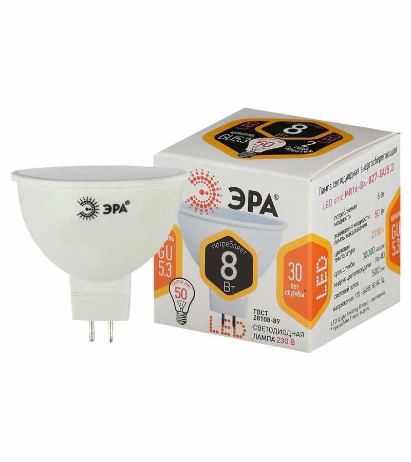Лампа светодиодная Эра 8, 50 Вт, цоколь GU5. 3, MR16, теплый белый свет, 30000 ч (8w-827-GU5.3)