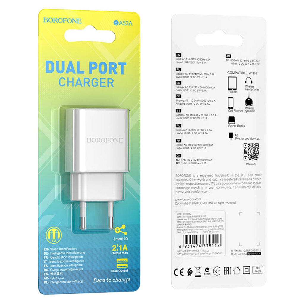 Купить Сетевое зарядное устройство Borofone BA53A, 2xUSB, 2.1 А, белое