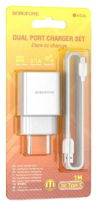 Сетевое ЗУ BOROFONE BA53A, 2хUSB-А, 2.1А + кабель (AM-Type-C), 1 м, белый