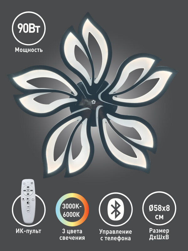 Люстра с пультом светодиодная потолочная 176W, 8 ламп, цветок, большая, белая, LEDCITY